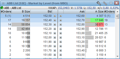 The Orderbook displays public buy and sell orders accumulated on price level (market by level, MBL) or by orders (market by orders, MBO). The order book can be resized to view any number of levels depending on your subscription. The order book window can be linked with order windows, see Linking of windows for more information. The default Orderbook displays orders accumulated by level. For selected markets the Orderbook can be displayed differently, e.g FX or Fixed Income data.