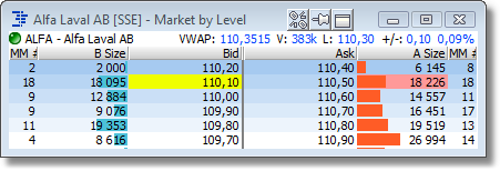 The Orderbook displays public buy and sell orders accumulated on price level (market by level, MBL) or by orders (market by orders, MBO). The order book can be resized to view any number of levels depending on your subscription. The order book window can be linked with order windows, see Linking of windows for more information. The default Orderbook displays orders accumulated by level. For selected markets the Orderbook can be displayed differently, e.g FX or Fixed Income data.