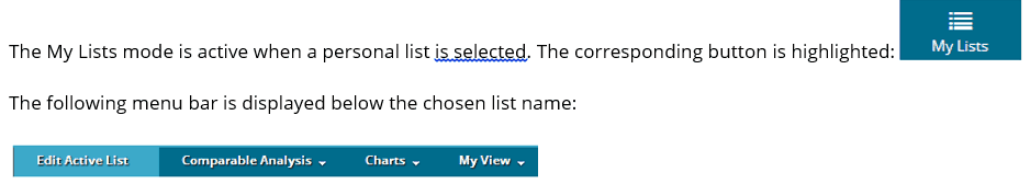 Infinancials is traditionally used with an active company and a predefined or personalized peer group. In some cases, e.g. after a screening, it is useful to use the Browse mode in My Lists to enable a quick analysis of each company within the selected list.