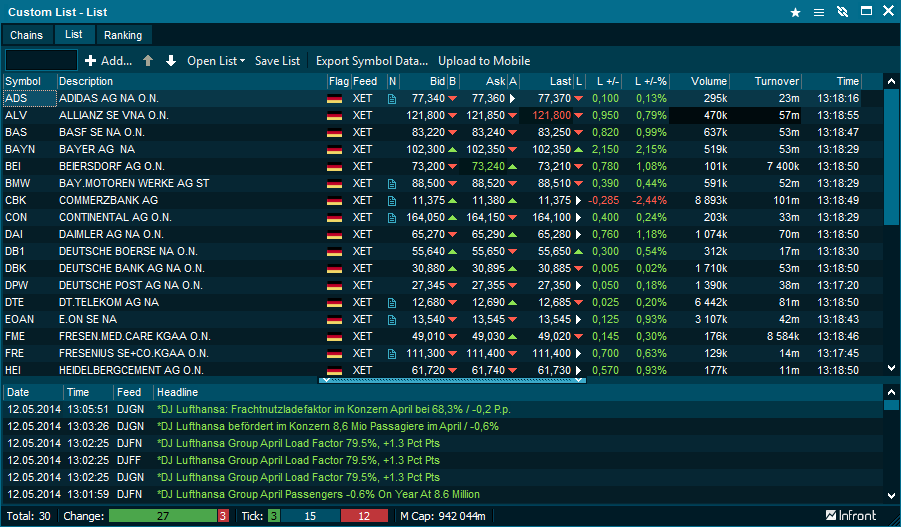 This tab allows you to compile lists from different markets. You can easily save different composite lists and change between them in one composite window. For example you could have one list compiled of oil companies and one for healthcare.