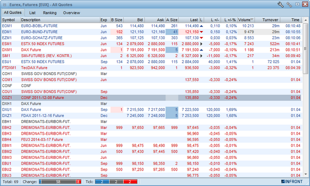 The market window displays a number of tabs depending on which market you are looking at. The following is a short description of each tab. All Quotes The All Quotes tab is available for markets where there is a pre-defined list of symbols. All information is updated continuously and changes are highlighted with different colors. To define your own colors, right-click in the Market Window and select Properties | Edit colors. Symbol information To view more details about a symbol right-click and get the Symbol menu Keyboard search To change the symbol type in the symbol code on your keyboard and press enter. The symbol will be displayed on the top of the Market window. Select Columns The columns displayed can be changed by selecting Properties | Select Columns. Sorting Columns The columns can be sorted by double-clicking on any column. The list will automatically stay sorted, even when the underlying values change in real-time. Indices The indices tab has the same features as the All Quotes tab but this tab displays only the indices for the selected market. This is optional and can be turned off in Tools | User Interface. Chains The chains tab has the same features as the All Quotes tab but this tab displays pre-defined lists from the server that can combine symbols or just be a sub section of All Quote. Read more. List The list tab has the same features as the All Quotes tab but this folder displays only the symbols you have manually added. This is done by right-clicking on a symbol and selecting Edit | Add to List. Note that the List also can be changed by: