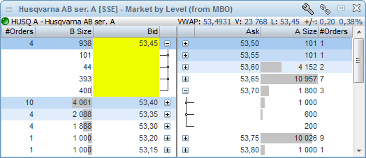 Colors to indicate insertions and deletions can be configured in the color setup dialog by clicking the wrench icon. Displaying different orderbook kinds Market by Level (MBL) Orderbooks In Market by Level orderbooks all the public orders on a symbol from a specific exchange are accumulated into unique price levels. So if there are three orders at 100 SEK, with volumes 1000, 2000 and 3000, there will be only one level in the orderbook at 100 SEK and with a total volume of 6000.