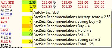 Market window: New Result and Estimates columns The new result and estimates key ratios from SME Direkt and FactSet are also available as columns in the market window. There are separate sets of columns for the two services. Double-clicking a fundamental column will open the the Details page for that symbol. The background color of the Recommendation columns indicates what direction the value represents (buy, hold, sell). The short and long names of these columns are prefixed with “S “/”SME Direkt:” and “F “/”FactSet:” to make it easier to see what source the values come from.