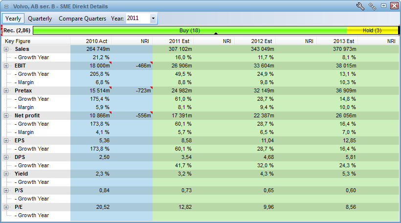 SME Direkt Level 2 provides a deeper level of fundamental data on Nordic companies with results, estimates and recommendations. It contains several years of historical results and future estimates in both yearly and quarterly resolutions. It allows drill-down into statistical details per company and visual presentation of historical trends.