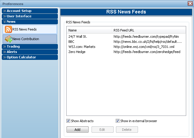 To access the RSS News feed setup go to Tools | Preferences | News | RSS News Feeds or simply right click in the "Mixed News" Window and select Configure RSS News.